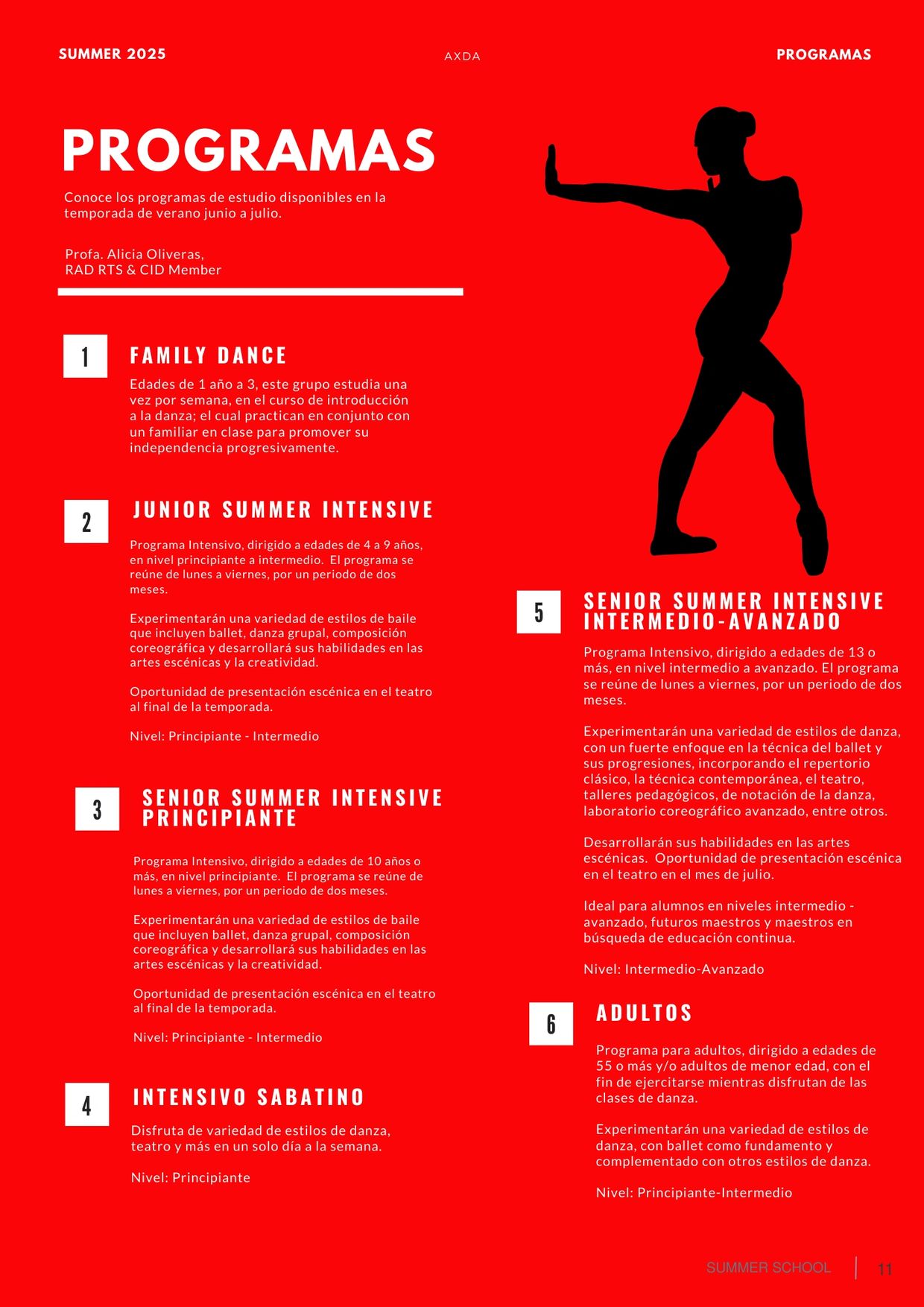En AXDA estamos muy orgullosos del progreso y la distinción de nuestros alumnos, fomentando la educación cultural de excelencia dentro y fuera de Puerto Rico. El período del verano corresponde a los estudios introductorios de las progresiones en cada nivel dentro del Summer School; permitiéndole acceso a los alumnos activos a conocer lo que serán sus estudios posteriores y a alumnos de nuevo ingreso y readmisiones a incursionar dentro de los programas intensivos en la categoría correspondiente a su edad y nivel.